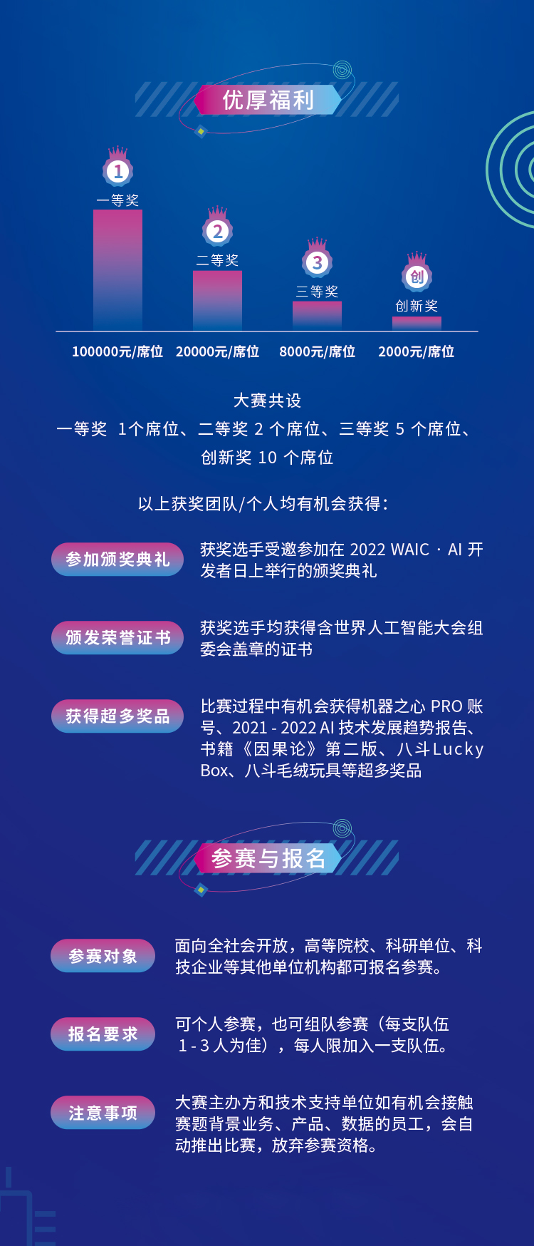 以「了不起的 AI 开发者」为主题,WAIC期间唯一一场黑客松赛事「WAIC 2022 · 黑客马拉松」各赛道已全面开启!此次黑客松大赛由世界人工智能大会组委会办公室主办,机器之心、上海市人工智能行业协会、九章云极DataCanvas公司、天池等机构承办。大赛将设立多条赛道,邀请多家业内领先企业基于实际业务命题,设立近百万现金大奖,旨在聚焦行业前沿热点,探索 AI 技术高峰,为全球各路开发者精英们提供同台竞技的平台!优秀选手们不仅有机会获得丰厚奖金,还将受邀参加9月1日-3日在上海举办的 WAIC 颁奖典礼。